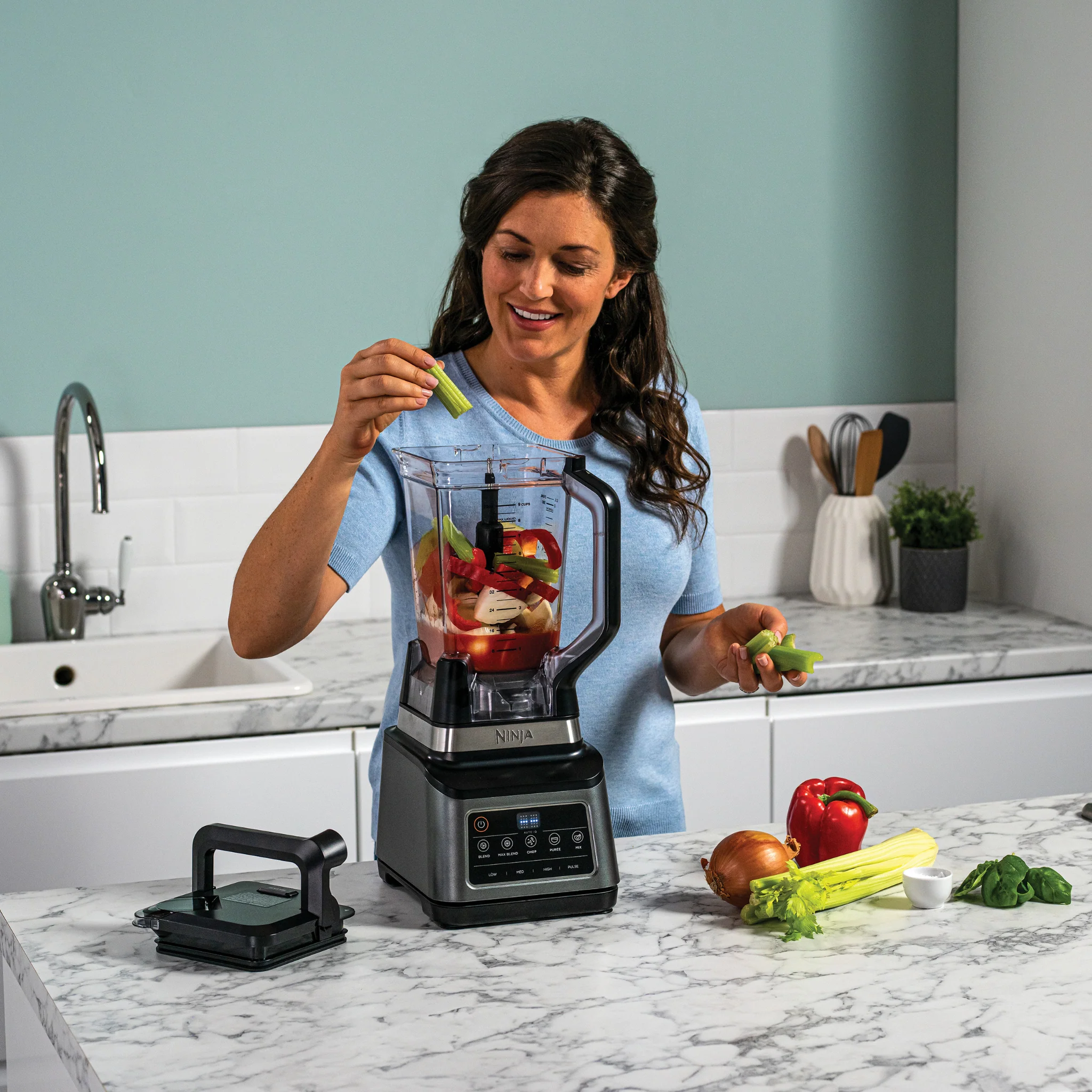 Create anything from dips to drinks, doughs to desserts with this 3-in-1Ā food processor, multi-serve blender and personal blender.